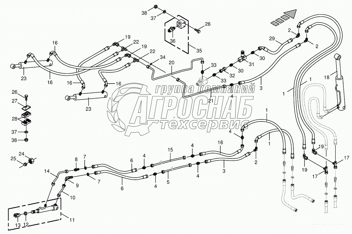 Каталог запасных частей к технике: KRONE BIG-X-500. Hydraulics-discharge chute-14-row